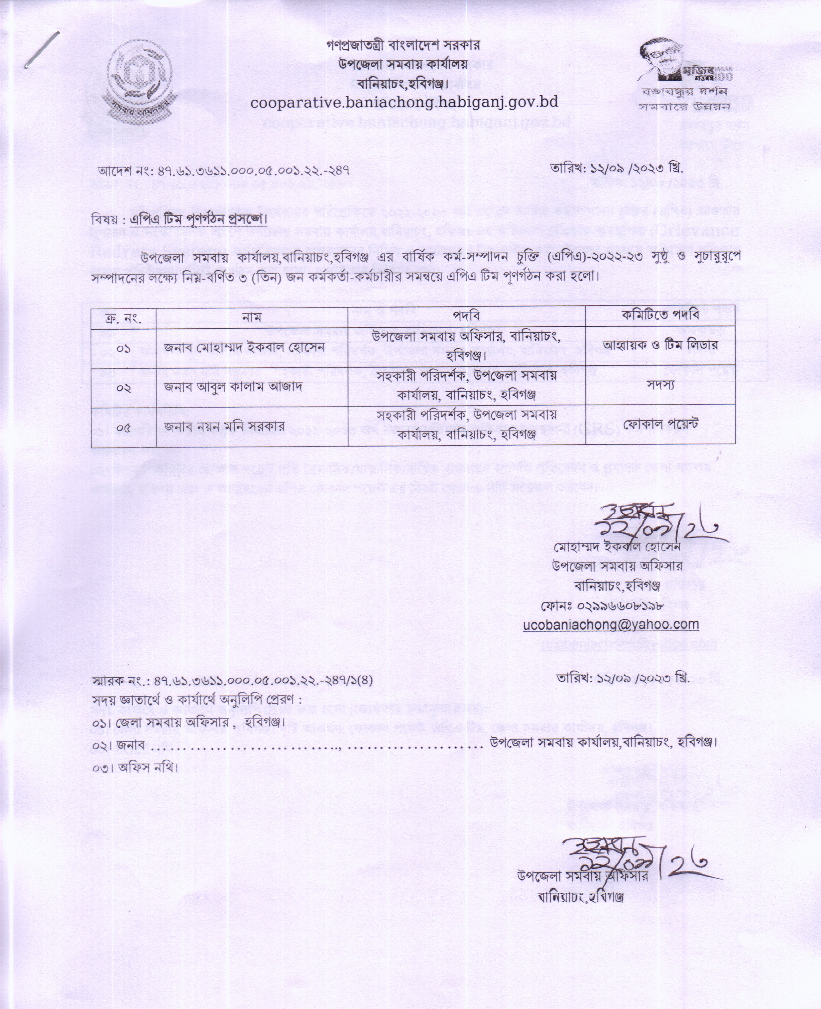 অত্র কার্যালয়ের সহকারী পরিদর্শক জনাব মোঃ আবুল কালাম আজাদ , উপজেলা সমবায় কার্যালয়, বাহুবল, হবিগঞ্জ এ বদলী ও পদস্ত হওয়ায় এপিএ টিম পুনর্গঠন করা হলো।